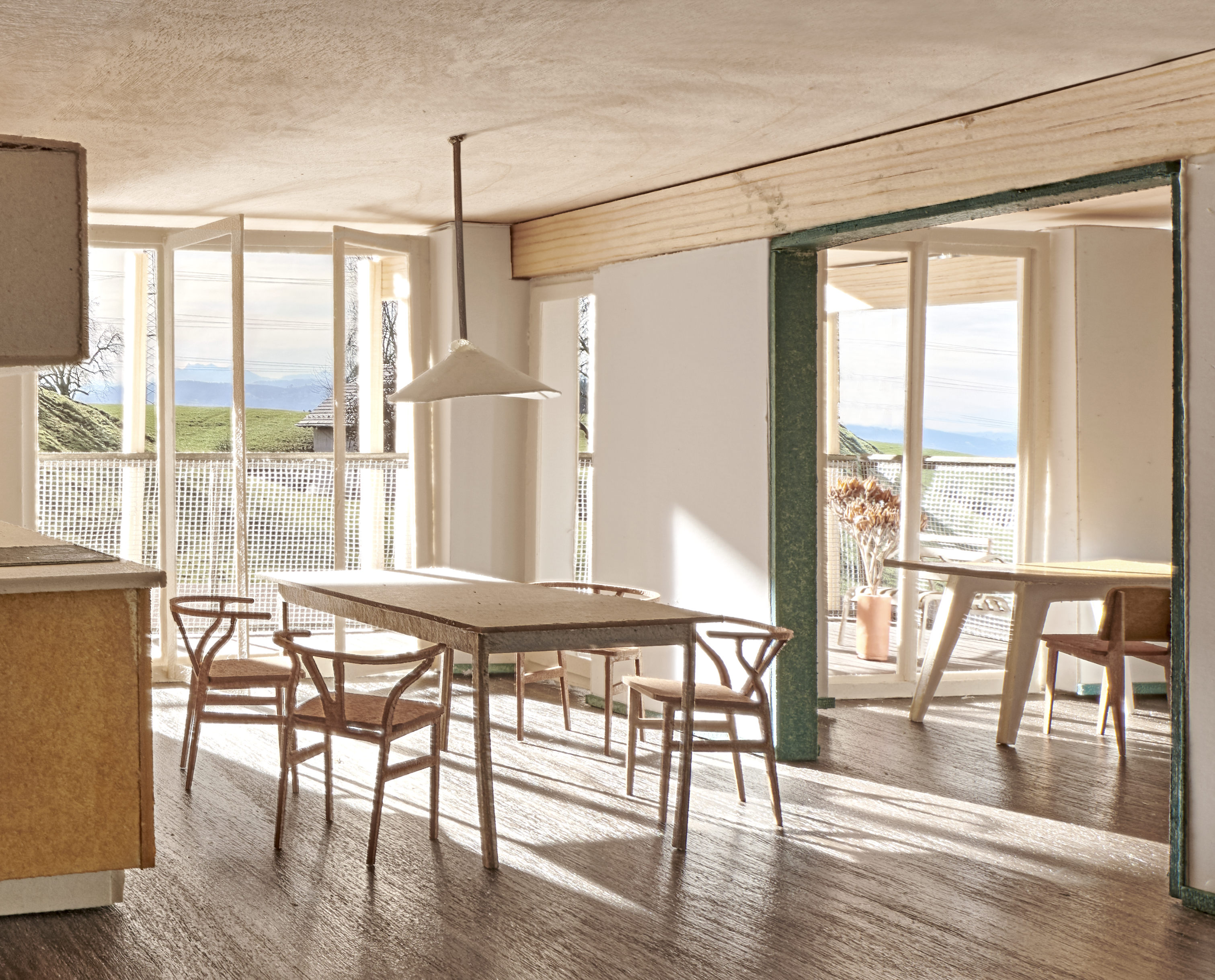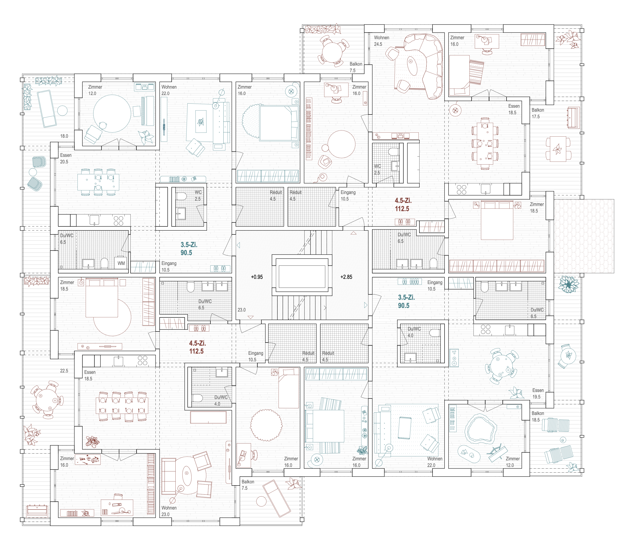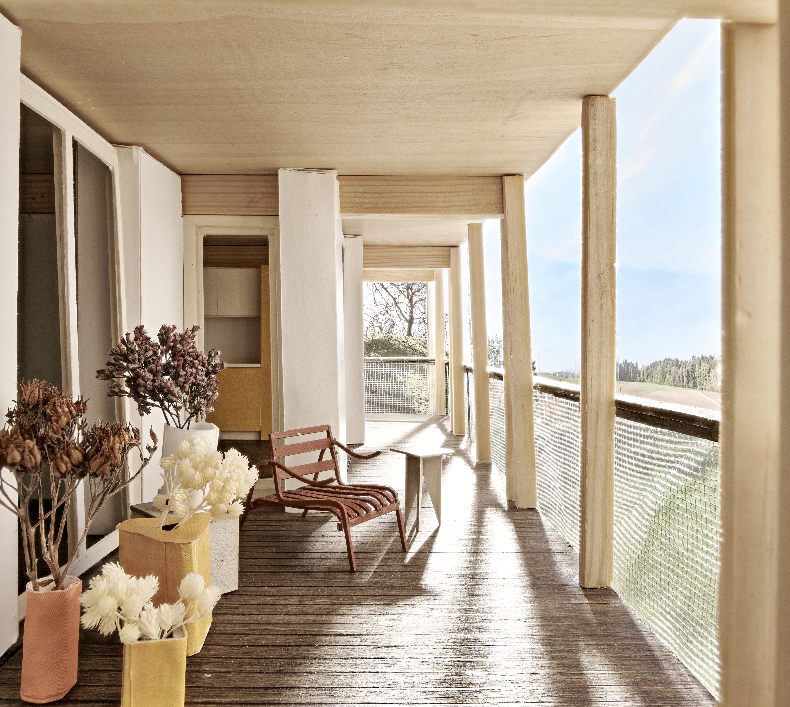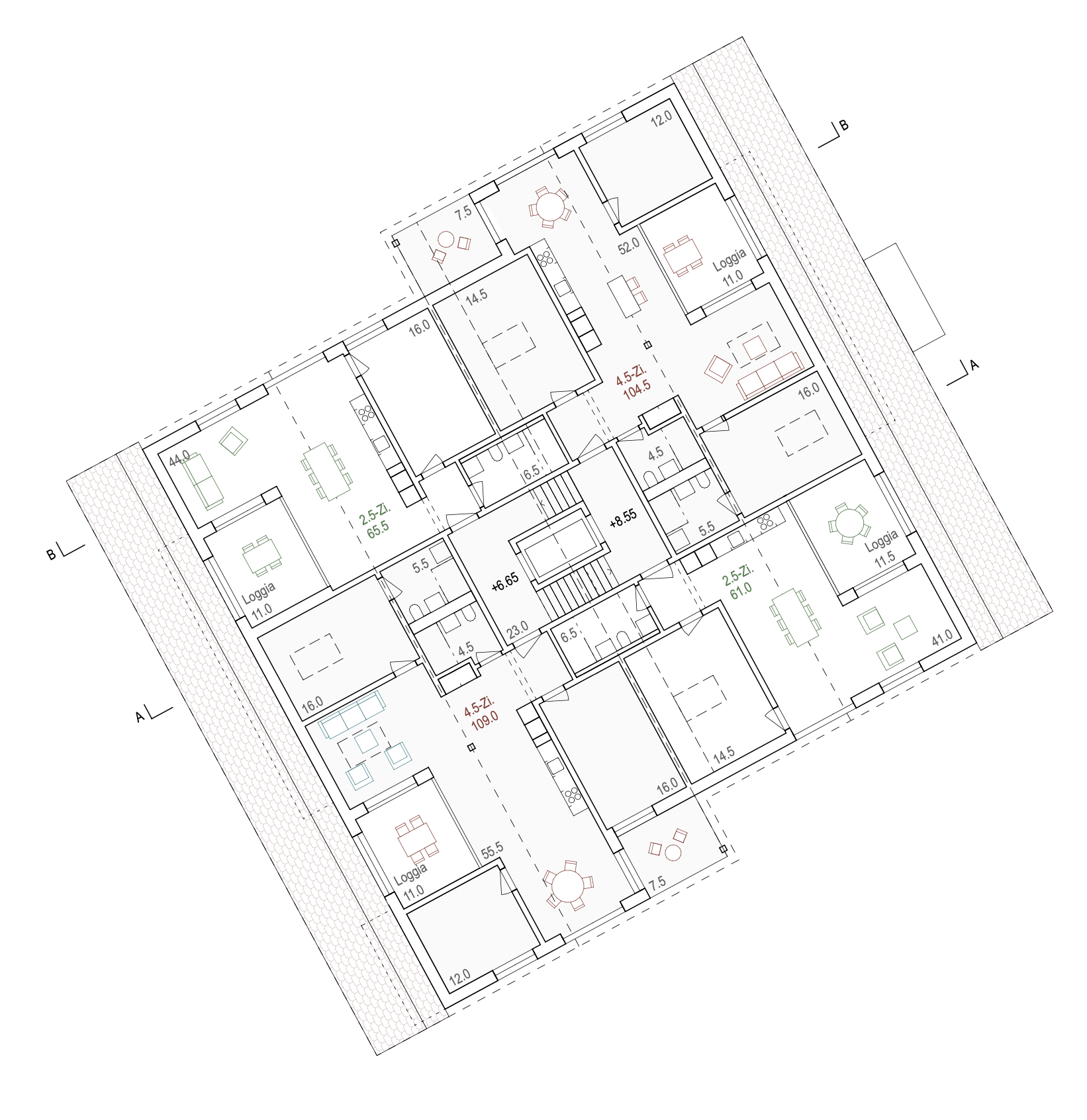 Ausgehend vom Hauseingang, wo sich die Briefkastenanlage in einem grosszügigen Windfang befindet, gelangt man am Trockenraum und dem Zugang zu den Bastelräumen vorbei ins Treppenhaus, welches im Schnitt 2/3-geschossig im Split-Level angelegt ist. Der zentrale Lift ist ausreichend gross, damit auch im Notfall eine Person liegend transportiert werden kann. Ältere Menschen verbringen viel Zeit zu Hause und identifizieren sich stark mit der eigenen Wohnung. Umso wichtiger ist es, dass sie viele Nutzungsmöglichkeiten und räumliche Grosszügigkeit bietet. Lebt man zu zweit, sollen mindestens zwei Zimmer als Schlafzimmer genutzt werden können. Die Nähe der Nasszelle zum Schlafzimmer ist für die Nacht umso wichtiger. Über diagonale Raumbezüge sind die unterschiedlichen Ausrichtungen der Wohnung jederzeit erfahrbar. Die Möglichkeit von verschiedenen Wegen innerhalb der Wohnung erlaubt es, unabhängig seinen Tätigkeiten nachzugehen und das Zu-Hause-Sein zu geniessen.
