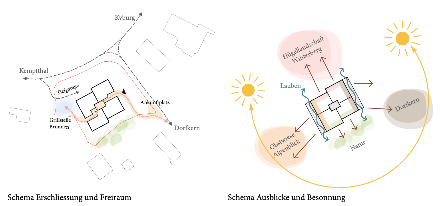 Der volumetrische Versatz ermöglicht allen vier Wohnungen, die pro Geschoss angeordnet sind, eine mindestens zweiseitige Orientierung, unterschiedliche Besonnung und Ausrichtung: Obstwiesen und Alpenblick, Hügellandschaft Richtung Winterberg, Ortskern von Ottikon oder kühlende, begrünte Hangkante. Das eingeführte Split-Level zwischen den Gebäudeteilen erlaubt es, dass sich diese an den Boden schmiegen und die Erdbewegungen gering sind. In der Fortführung der Bewegung der beiden Satteldächer ist je eine Raumschicht als Laube vorgelagert. Der architektonische Ausdruck des Hauses orientiert sich an den verputzten Wohnbauten, weshalb die Holzschalung der Fassade gelb-weisslich gehalten ist. Die roten Deckleisten und Brüstungsverkleidungen referenzieren Fachwerkelemente, die sich im Ort an den Wohntrakten der Bauernhäuser wieder finden.
