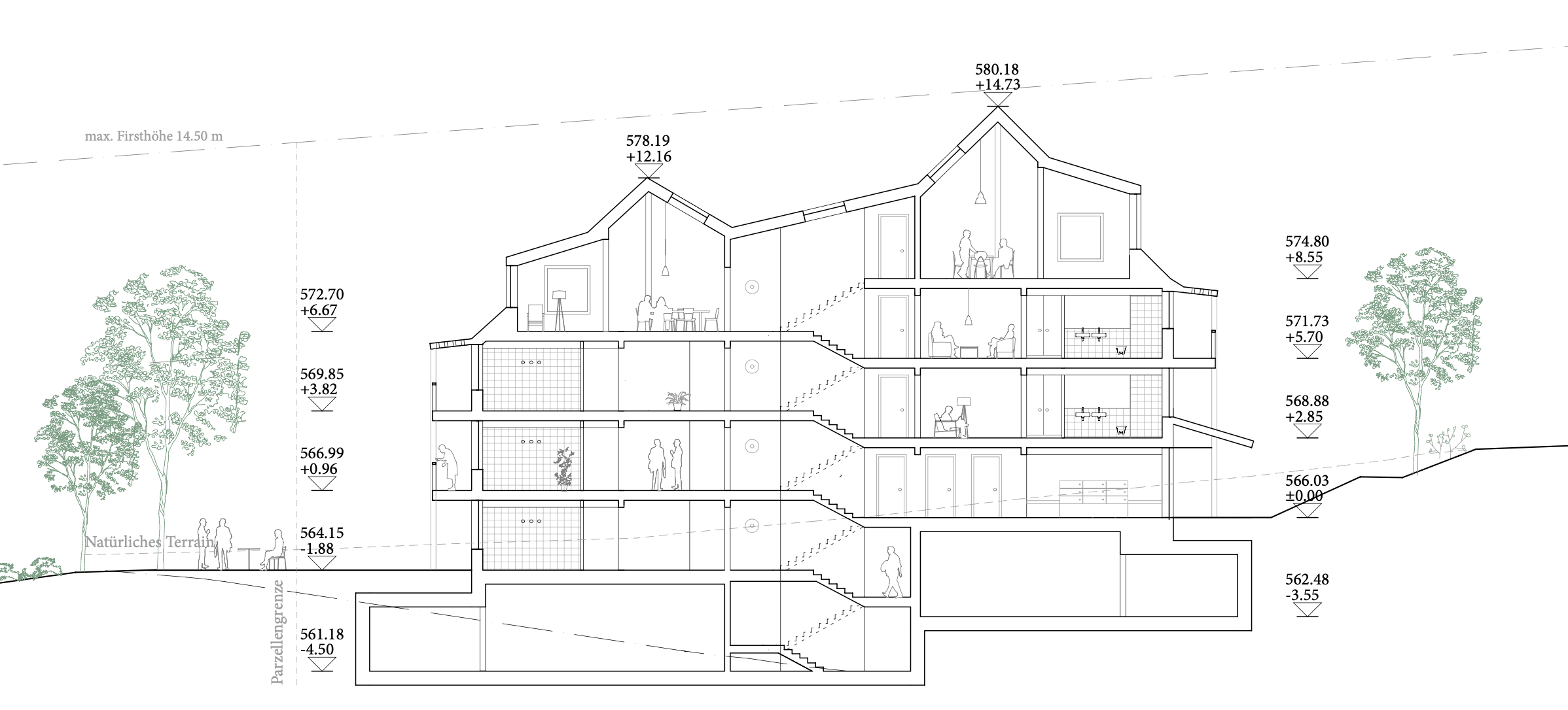 Ausgehend vom Hauseingang, wo sich die Briefkastenanlage in einem grosszügigen Windfang befindet, gelangt man am Trockenraum und dem Zugang zu den Bastelräumen vorbei ins Treppenhaus, welches im Schnitt 2/3-geschossig im Split-Level angelegt ist. Der zentrale Lift ist ausreichend gross, damit auch im Notfall eine Person liegend transportiert werden kann. Ältere Menschen verbringen viel Zeit zu Hause und identifizieren sich stark mit der eigenen Wohnung. Umso wichtiger ist es, dass sie viele Nutzungsmöglichkeiten und räumliche Grosszügigkeit bietet. Lebt man zu zweit, sollen mindestens zwei Zimmer als Schlafzimmer genutzt werden können. Die Nähe der Nasszelle zum Schlafzimmer ist für die Nacht umso wichtiger. Über diagonale Raumbezüge sind die unterschiedlichen Ausrichtungen der Wohnung jederzeit erfahrbar. Die Möglichkeit von verschiedenen Wegen innerhalb der Wohnung erlaubt es, unabhängig seinen Tätigkeiten nachzugehen und das Zu-Hause-Sein zu geniessen.