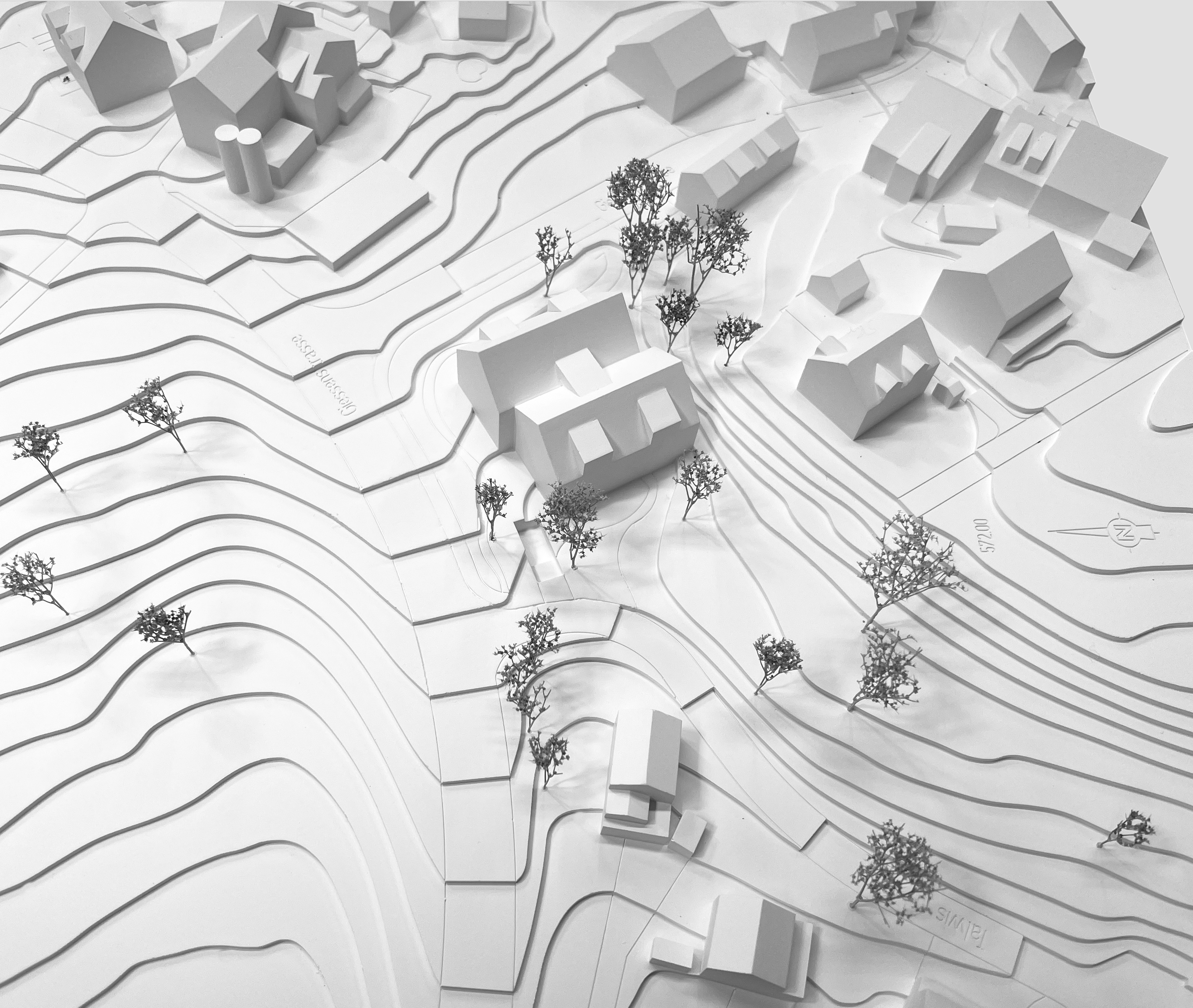 Ankommend auf der Landstrasse von Kempttal her befindet sich das Grundstück an prominenter Lage am Ortseingang zu Ottikon. Zwei mit einem Versatz zu einem Doppelhaus gefügte Volumina mit Satteldach formen einen Baukörper, der sich in Massstäblichkeit und Firstrichtung in die bestehende Bebauung eingliedert. Er bildet zusammen mit den Wohnbauten im Alpenblick, Talwis und dem Bauernhof an der Giessenbachstrasse eine Kulisse von giebelständigen Volumina, die sich wie in einem Theater dem geschwungenen Strassenverlauf entlang ausrichten. Der Auftakt ins bäuerlich geprägte Ortsbild erfährt durch den Neubau einen neuen Akzent; Menschen willkommen-heissend oder verabschiedend.