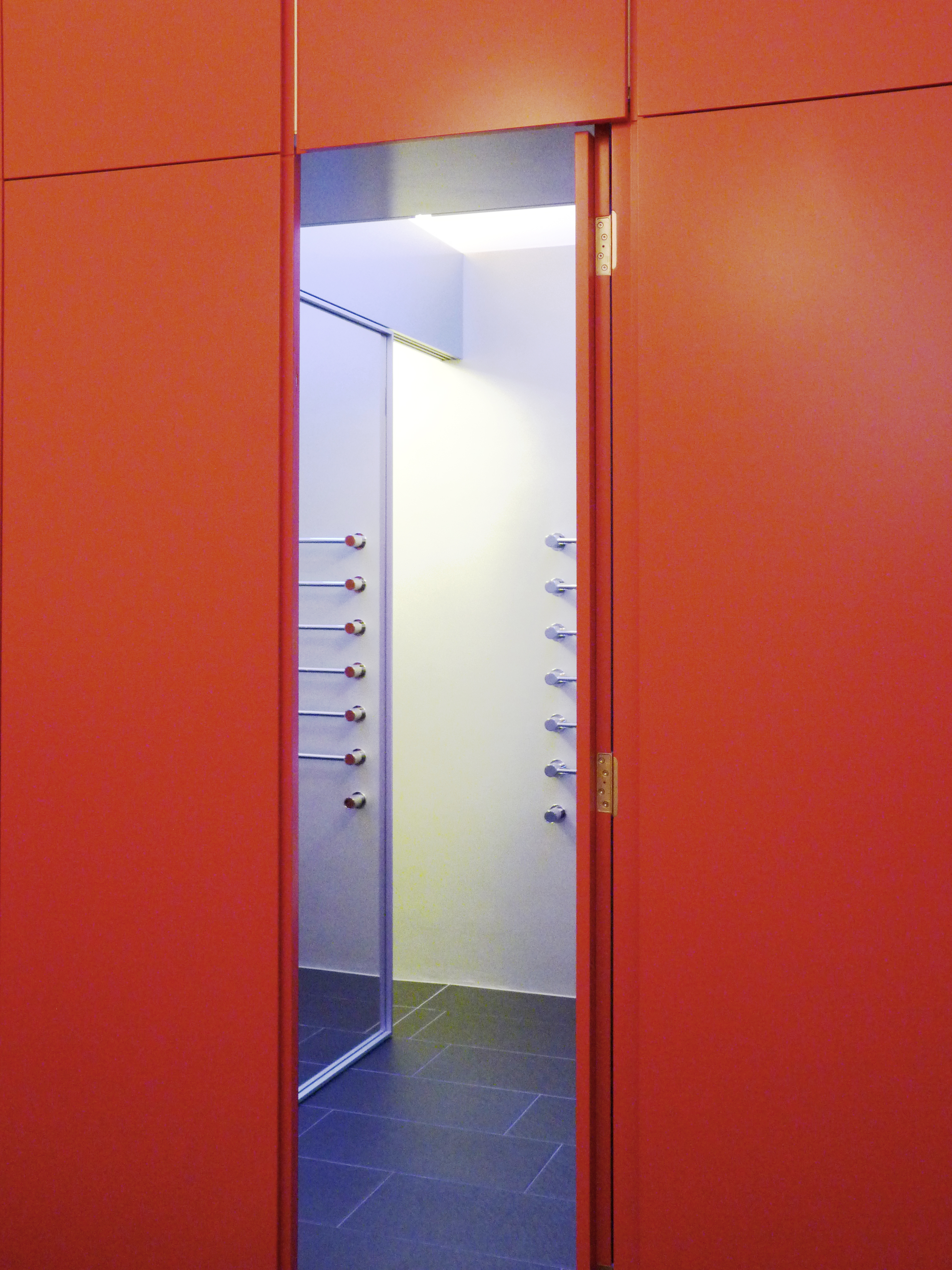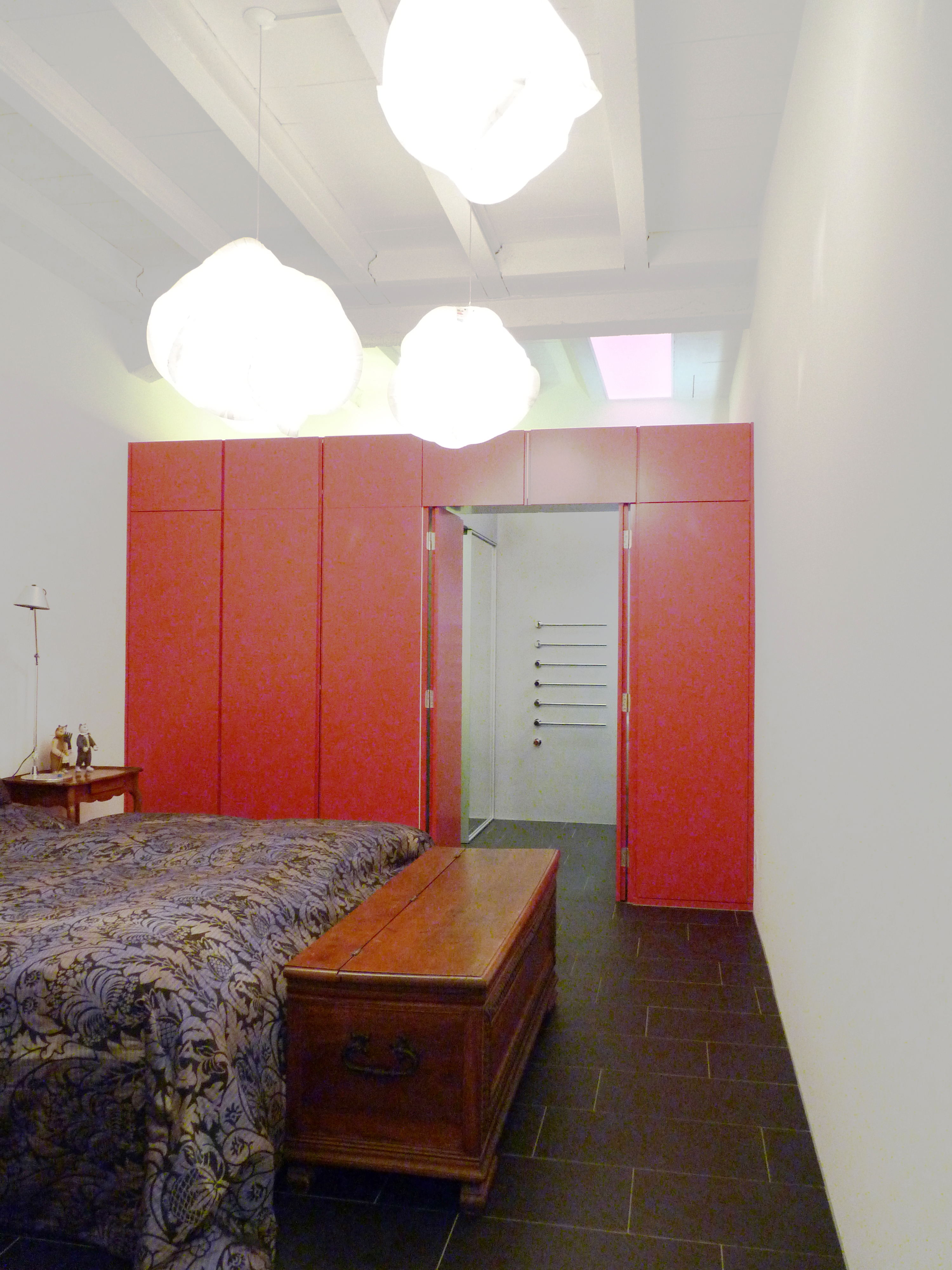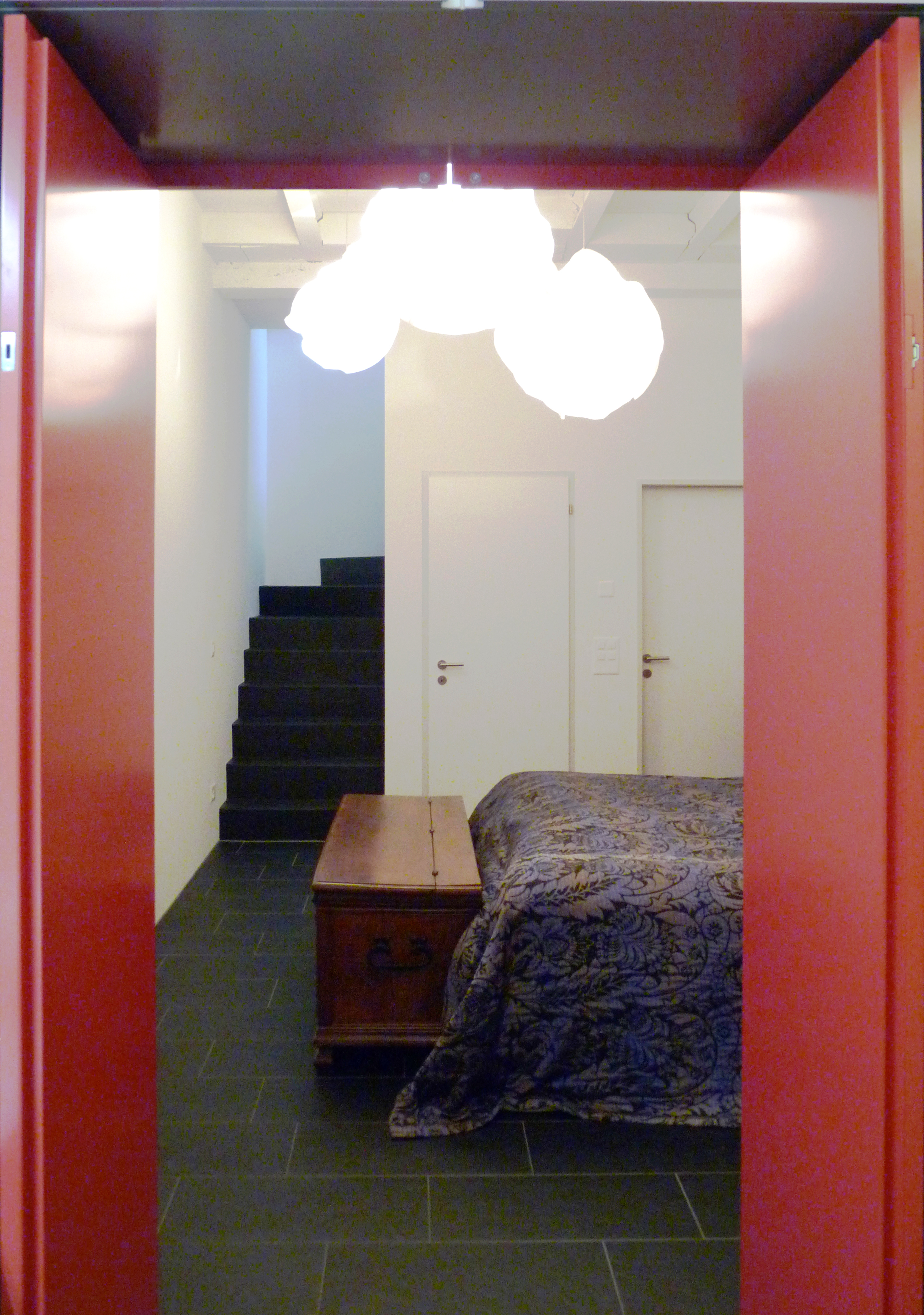 Zum Zimmer bieten vier Wandschränke Stauraum; die Flügeltüren zum Badezimmer öffnen sich in die Leibung, so dass sie nicht im Weg stehen; eine Schiebetür mit grossflächigem Spiegel verschliesst entweder das WC oder die Dusche; der Spiegelschrank wurde in der Vorwand versenkt; in der Auflagefläche des Waschtischs sind zwei Schubladen integriert. Das WC und die Dusche werden durch einen Deckel mit Plexiglasausschnitt, der den Blick auf die Industriedecke frei gibt, geschlossen. Über dem raumbreiten Waschtisch ist der Kubus nach oben offen. Ein Oberlicht zum darüberliegenden Erdgeschoss bringt Tageslicht in den sonst ausschliesslich künstlich belichteten Raum.