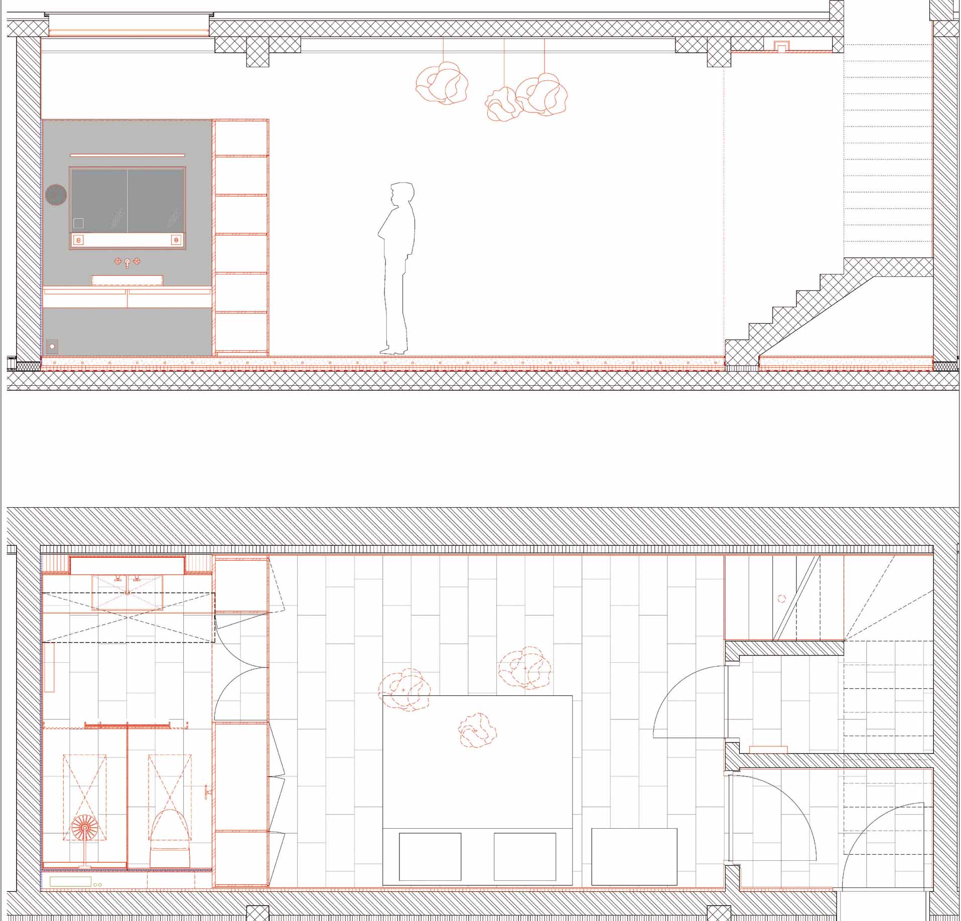 In einer zweigeschossigen Loft, galt es im Untergeschoss den Kellerraum zum Schlafraum mit eingebautem Badezimmer auszubauen. Die Raumhöhe von 3.5 m und die bestehende Hourdis-Decke auf Stahlträgern boten ideale Voraussetzungen, um den Loft-Charakter des Raumes zu stärken.
