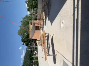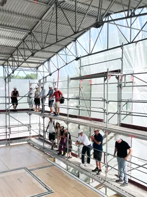 Zusammen mit der Baukommission besichtigen wir unsere Baustelle in Pfäffikon → in Pfäffikon. Unter dem Wetterdach könnte man ein Fest feiern!