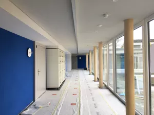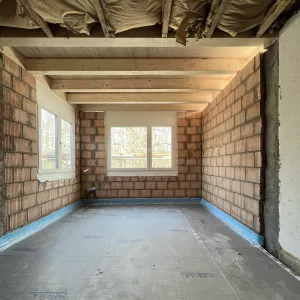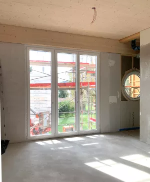 Auf der Baustelle in Ramsen ist der Unterlagsboden eingebracht und die Fassade geschlossen. So kann man schon die Zimmer und Raumproportionen erleben.