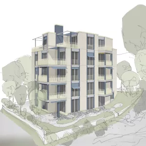 Für ein gehobenes Alterswohn-Projekt am Ortsrand von Ottikon bei Kemptthal→ haben wir einen effizienten, räumlich vielfältigen Vierspänner in Holzbauweise entworfen.