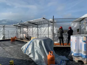 Seegarten Hünibach: Der Rohbau Anbau West ist fertig. Wir geniessen vom Dach aus die Sicht auf die Stockhornkette.