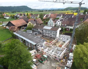 Der Rohbau mit Zimmeranbauten für der Sanierung der Mehrfamilienhäuser in Turgi ist fast abgeschlossen.