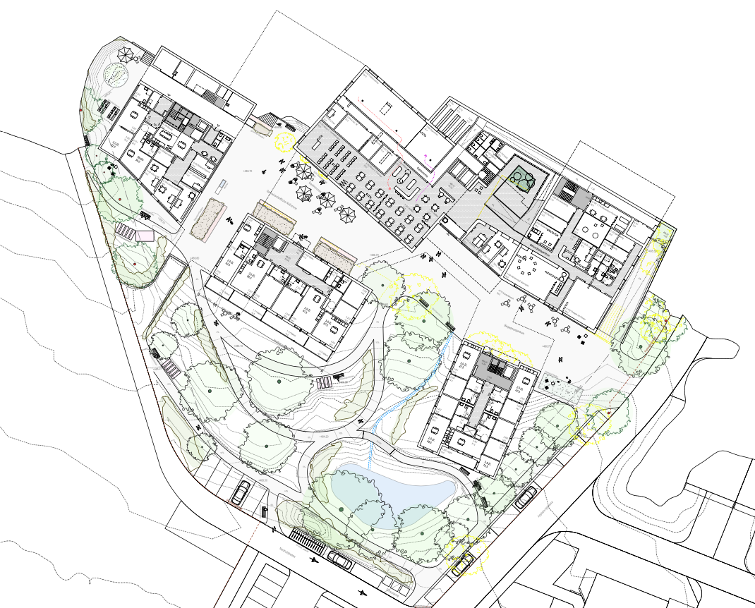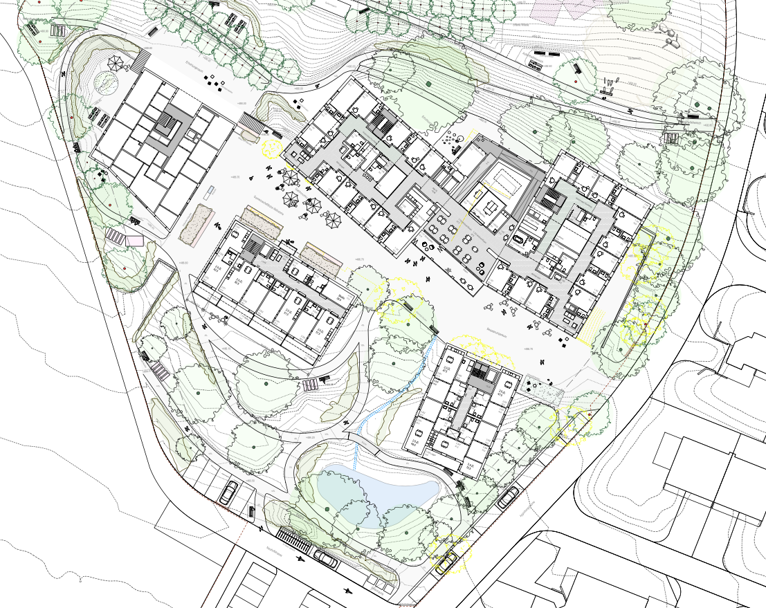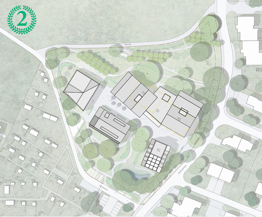 Grundlegend für den Entwurf ist die Absicht, einen Ort zu schaffen, an dem sich Menschen in natürlichen Nachbarschaften treffen und austauschen können: Angefangen bei der ortsbaulichen Setzung, die den Dorfcharakter stärkt, über die einzelnen Häuser, die den menschlichen Massstab erhalten hin zu den einzelnen Zimmern, die eine wohnliche Atmosphäre in Wärme und Geborgenheit bieten, ist das Zentrum Allmendhof ein integrativer und gemeinschaftlicher Ort. Die Stimmung ist heiter und gesund, offen und gleichberechtigt. Der Projektvorschlag erzeugt eine Dichte von Identitäten, die vom Dorfplatz bis in die Wohngruppen zu spüren ist: kommunikativ, einladend, gemeinschaftlich – eben „insieme“.