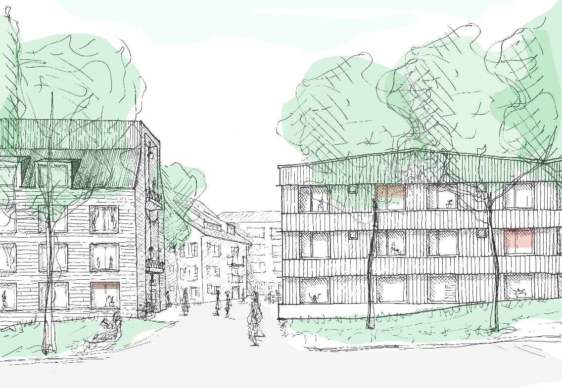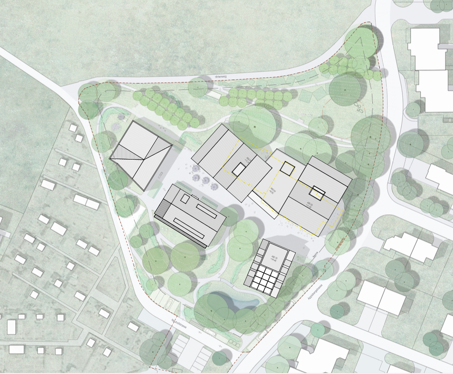 Die Körnung und Morphologie der vorgefundenen Strukturen werden selbstverständlich fortgeführt. Ausblicke auf den Zürichsee und in die umliegenden Grünräume sowie Orientierung und Besonnung sind massgebend für die Setzung und Ausformulierung der Volumina. Der transformierte (Wieder-) Erkennungswert erzeugt eine konstante Identifikation mit dem Ort, stärkt das Zugehörigkeitsgefühl und die Eingliederung ins angrenzende Quartier. So schaffen die neuen Baukörper den Übergang von Wohnquartier zu Landschaftszone und kreieren eine Dichte, die dem Ort entspricht und der Nutzung zu Gute kommt.