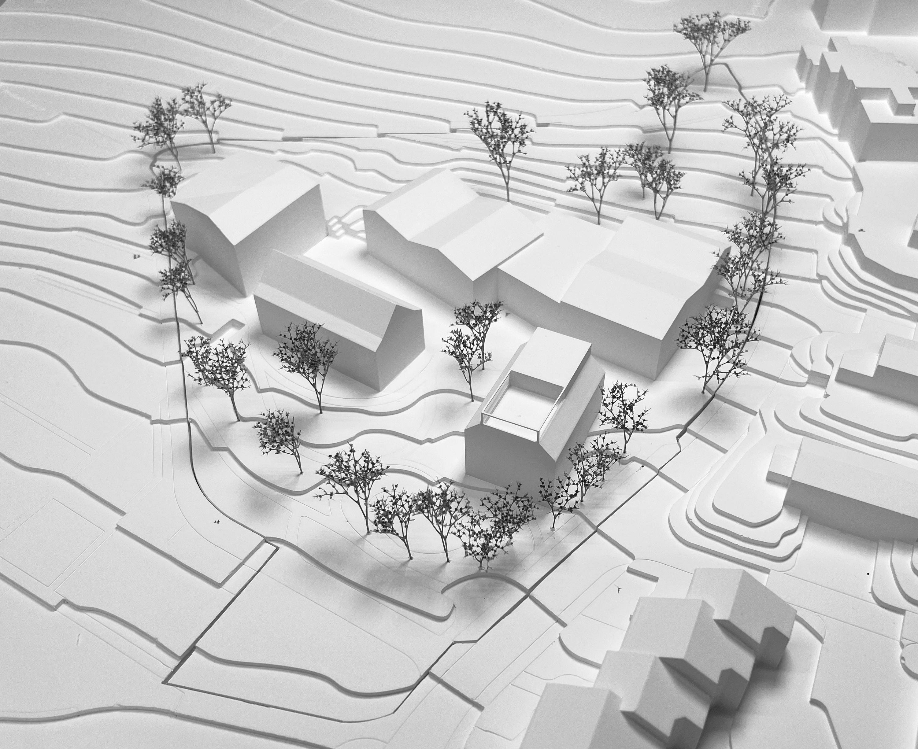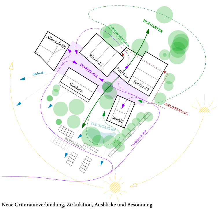 Das heutige «Allmendhöfli» ist anstelle eines Bauernhaues mit Scheunenteil gebaut. Der vordere Allmendhof, das Gutshaus, wurde bereits ca. 1960 um eine Achse ergänzt und nach dem Brand in gleicher Aussenform wieder errichtet. Scheunen oder Ställe – ganz in Tradition entlang der Höhenlinien ausgerichtet – wurden nach Notwendigkeit im hinteren Bereich, dort wo das heutige Pflegeheim steht, errichtet. Der bereits bestehende Dorfplatz und die unterschiedlichen Grünflächen sind gewachsene, identitätsstiftende Ortsqualitäten. Dieses vorgefundene Grundgefüge der über die Zeit gewachsenen Komposition, Typologie und Ausrichtung der Gebäude und Aussenräume möchten wir pflegen und sehen es als Grundstein einer selbstverständlichen Weiterentwicklung des Ortes mit dörflichem Charakter.
