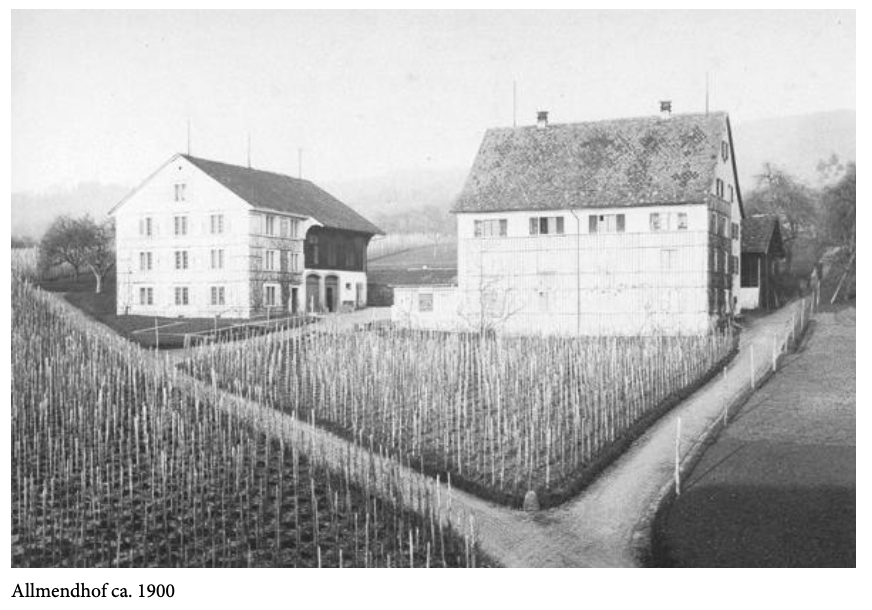 Männedorf, am rechten Zürichseeufer am südlichen Hang des Pfannenstiels gelegen, entwickelte sich aus einer Tradition der Landwirtschaft. Fischer, Bauern und Winzer bewohnten hauptsächlich das Dorf, dessen Kern bis heute am Seeufer liegt. Sie bewirtschafteten die Hügel, die vor allem Weinbauern zur besseren Bewirtschaftung in Terrassen verwandelten. Es entstanden bäuerliche Gebäudegruppen, die in ihrer Nutzung hauptsächlich Scheunen, Bauern- oder Gutshäuser waren und eng in Verbindung mit der umliegenden Natur standen. So finden wir heute das Areal des Allmendhofes als Zeuge seiner Geschichte vor. Am Rand der Landwirtschaftszone gelegen verweist schon der Namensteil «Allmend» auf die ursprünglich gemeinschaftlich-landwirtschaftliche Nutzung der Parzelle als bäuerliches Weingut. Historische Bilder zeigen auf, dass die Gebäude in ihrer Setzung immer wieder ergänzt und transformiert wurden.
