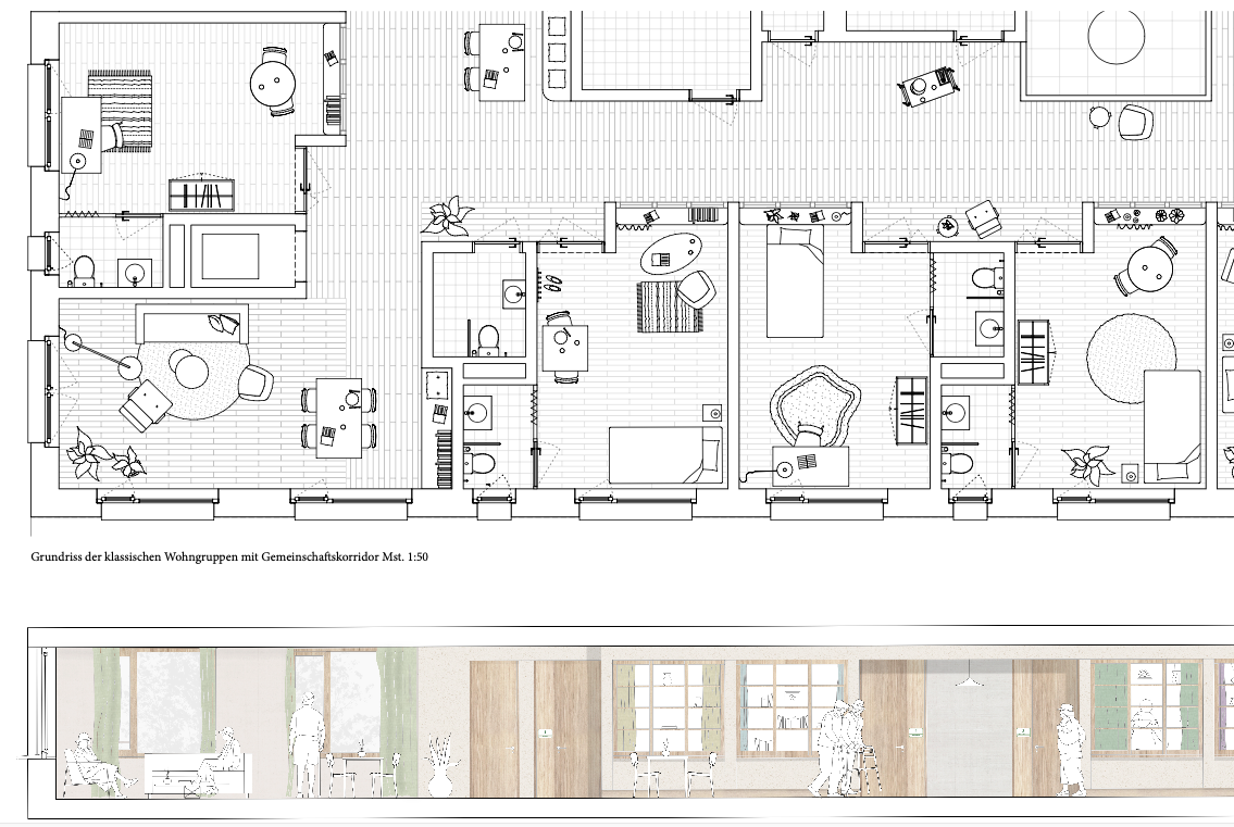 Der nachbarschaftliche Austausch ist in die einzelnen Wohngruppen der Schüüren fortgeführt. Die Zimmer haben hinter ihrem Fenster zum Korridor ein eingebautes Regalmöbel, das nicht nur die Aufbewahrung von Lieblingsstücken erleichtert, sondern gleichzeitig wie eine kleine Visitenkarte der Bewohnenden funktioniert und so für Gesprächsthemen und Interesse sorgt, die der erste Schritt hin zur gemeinschaftlichen Kommunikation sind.